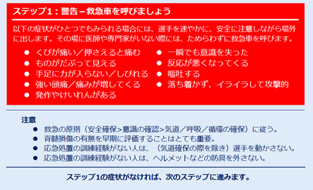 なお、過去12ヶ月以内に脳振盪を起こした既往がある選手に関しては、専門医による慎重な対応が必要とされるので、再受傷後の競技復帰に関しては専門医の指導を受けるようにして下さい。