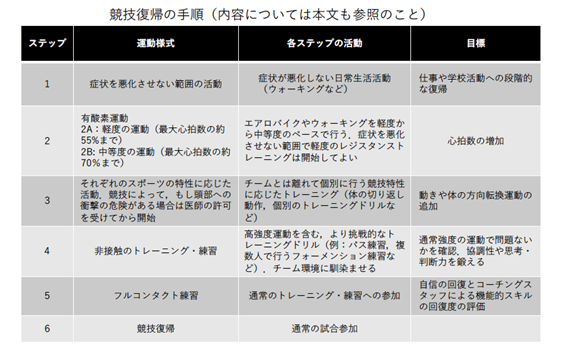 各ステップの確認は24時間かけることとし、以降の復帰プロトコールに沿って段階的に活動度を上げ、順調に行けば約1週間のプロセスを経て競技復帰が許可されます。