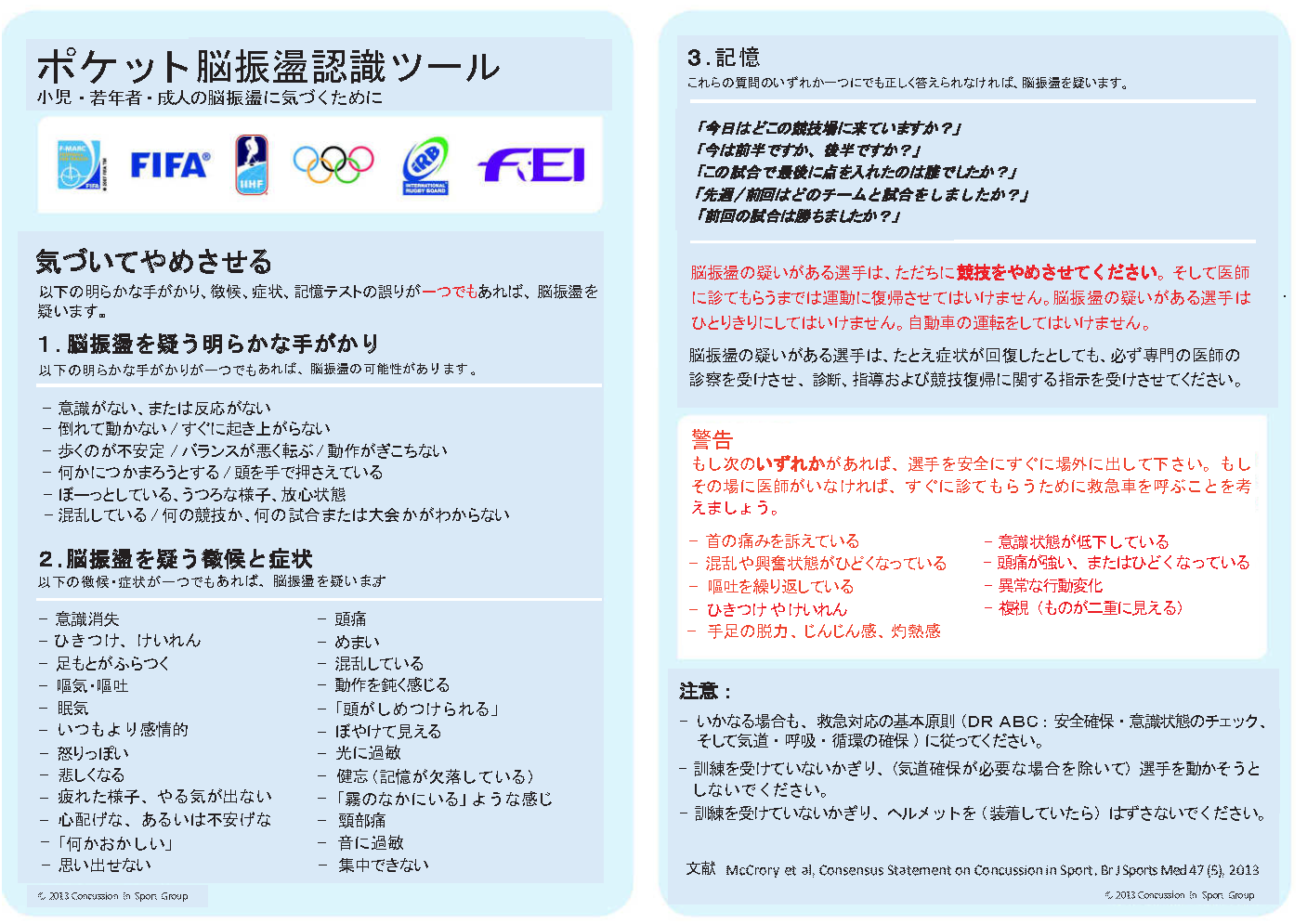 脳振盪の対応については日本スポーツ振興センターから出ている脳振盪ハンドブックも参考にしてください。